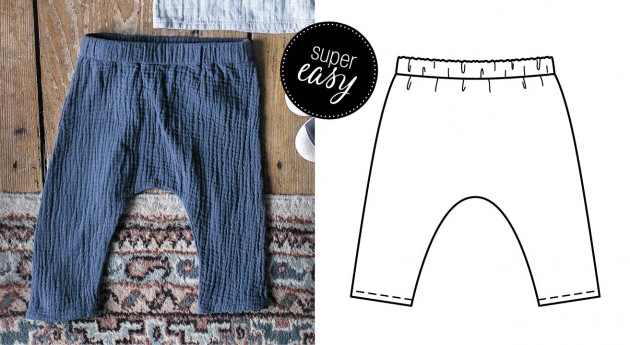 Dostatek prostoru pro plenku a komfort poskytují měkoučké mušelínové kalhoty jen ze dvou dílů a pásku, jímž je provlečená guma stejně jako lemy nohavic. Tento jednoduchý kousek hravě zvládnou i maminky, které se šitím teprve začínají.