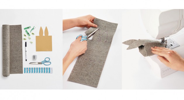 2. KROK Švové přídavky sestřihněte na šíři asi 3 mm a zajíčka vycpěte vatou. Otvor ve švu zašijte na šicím stroji. Mezi uši přišijte šňůrku na zavěšení.