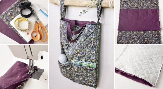 1. krok Taška: Z nylonu, bavlněné látky a vatelínu vystřihněte s přídavky na švy vždy obdélník 30 x 80 cm. Nakládaná kapsa: 30 x 15 cm. Vatelín nažehlete na nylon a díly prošijte podél linií kosočtverců.