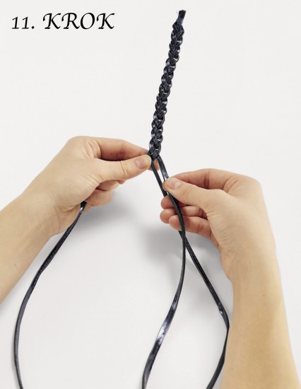 11. KROK: Ze 3 kožených proužků upleťte pravidelný copánek. Druhý konec copánku svažte pevně nití.