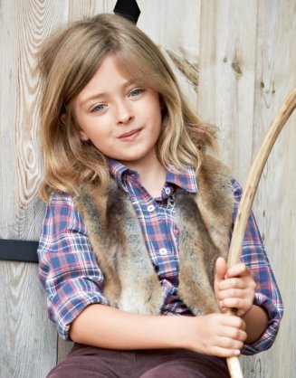 Vypodšívkovaná vestička z imitace kožešiny je jako stvořená ke kárované košili a k manšestrovým kalhotám džínsového střihu s páskem, jehož zadní partie je kvůli pohodlnému nošení stažena do gumy.