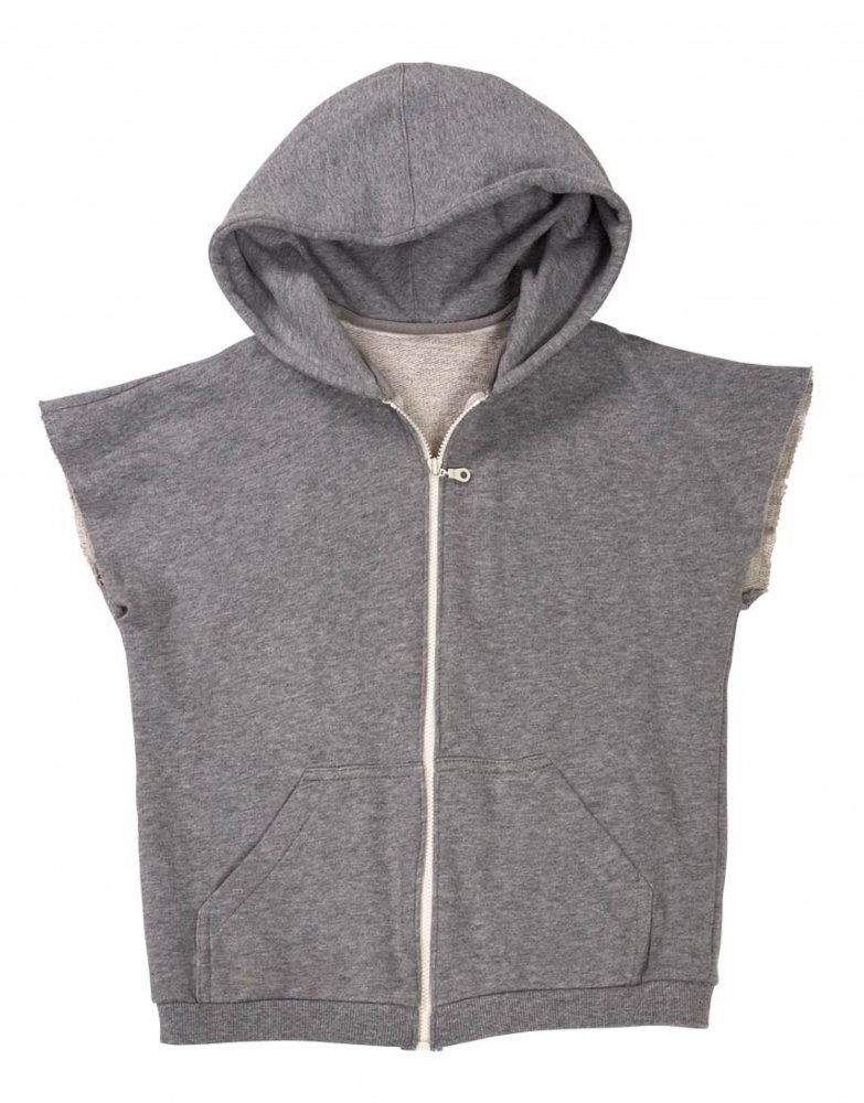 Vestička s přepadajícími rameny, kapsami a kapucí se zapíná na zip a oblékat se dá takřka univerzálně, např. přes overal bez rukávů.