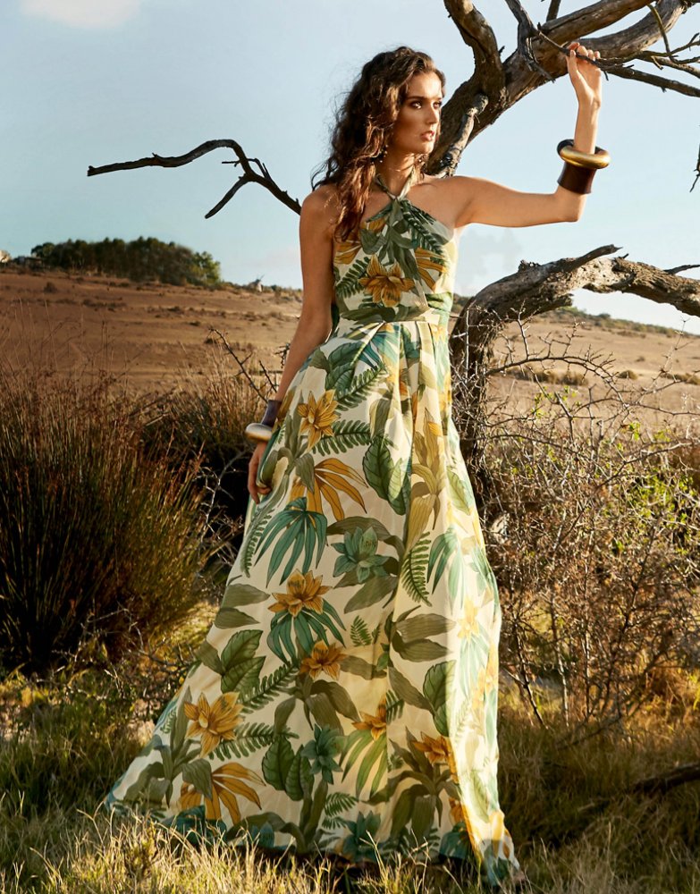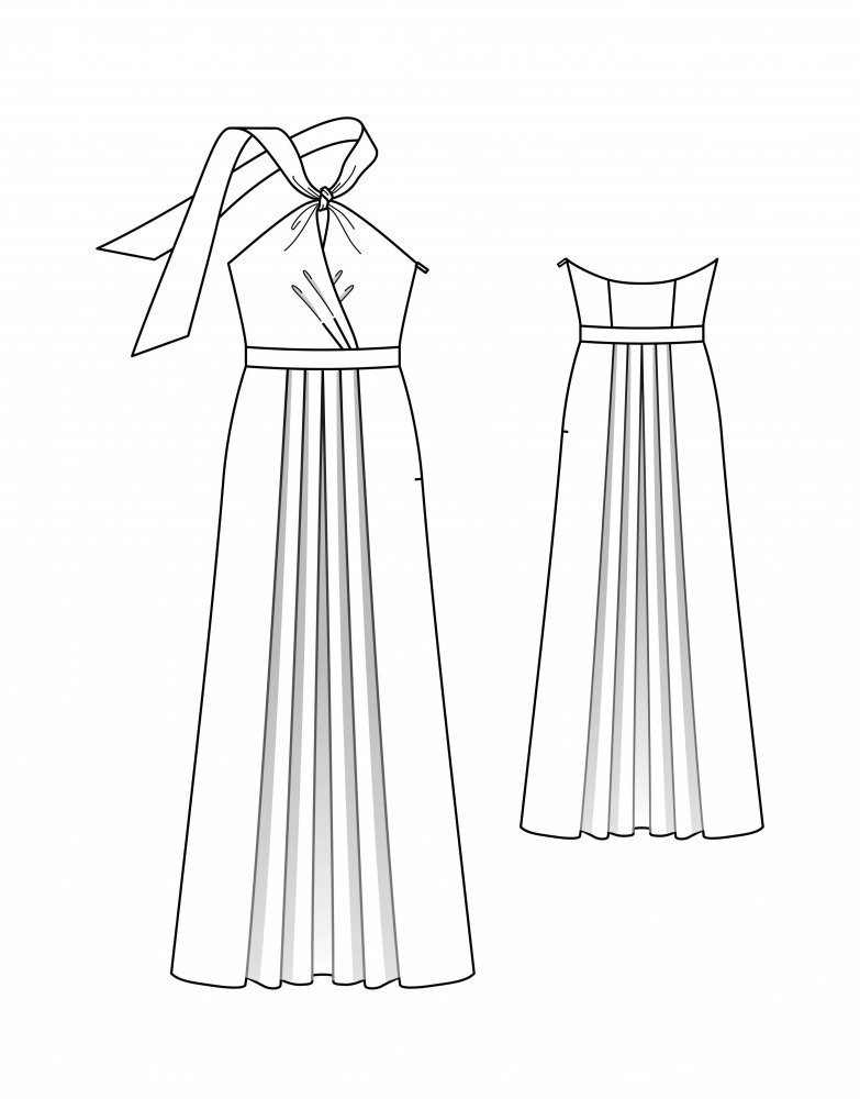 Přehlídka dokonalosi začíná u zdařené kumulace záhybků, pokračuje vázačkou svazující se za krkem na uzel nebo mašli, přičemž její konce zlehka poletují kolem zad. Hedvábnou noblesu pak korunují překřížené přední díly živůtku přidávající na objemu v těch správných místech.