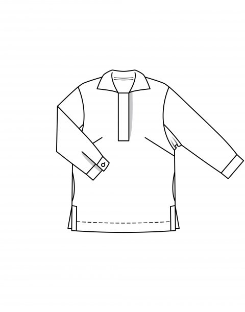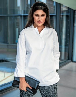 Minimalistická halenka je lehce tvarována dlouhými prsními záševky a rozparky v bočních švech. Ležérní variace kancelářského outfitu.
