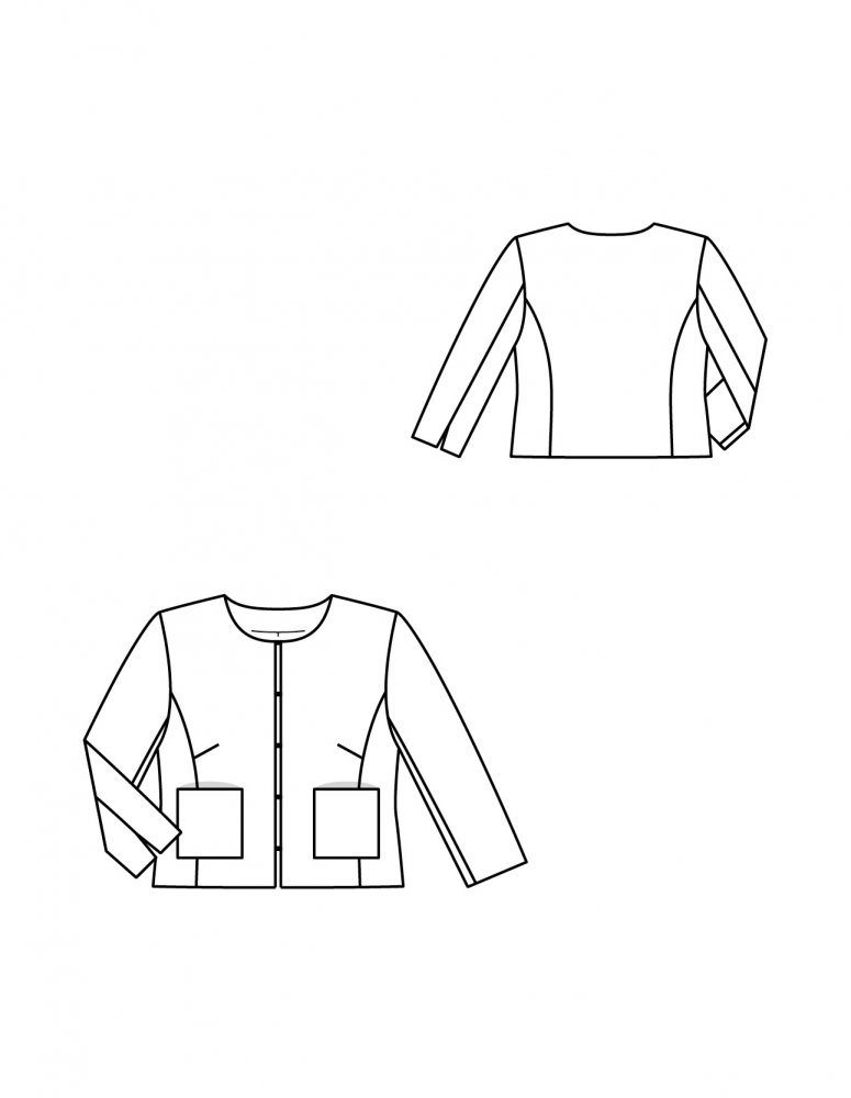 Díky členícím švům sedí kabátek z efektního žakáru jako ulitý. O další modelaci se postaraly prsní záševky. Ke zjemnění vzhledu posloužilo zkrácení rukávů, které dosahují pouze sedmiosminové délky a odhalují zápěstí. To skýtá jedinečnou přiležitost náramkům, tak toho využijte.