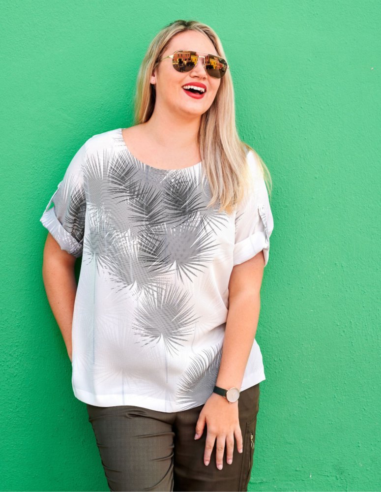 Čím nápadnější látka, tím prostší konstrukce. V této halence se dá chodit do práce i na výlety. A právě díky tomu odpadá dilema: Co na sebe? Proporčně vhodným protipólem budou dlouhé kalhoty nebo pouzdrová sukně.