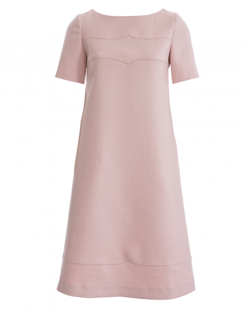 Jednoduchý model z růžového gabardénu charakterizují střídmé, přímočaré linie a polopřiléhavá silueta, která se směrem dolů mírně rozšiřuje. Osobitým ozdobným prvkem jsou ručně prošité příčné švy.