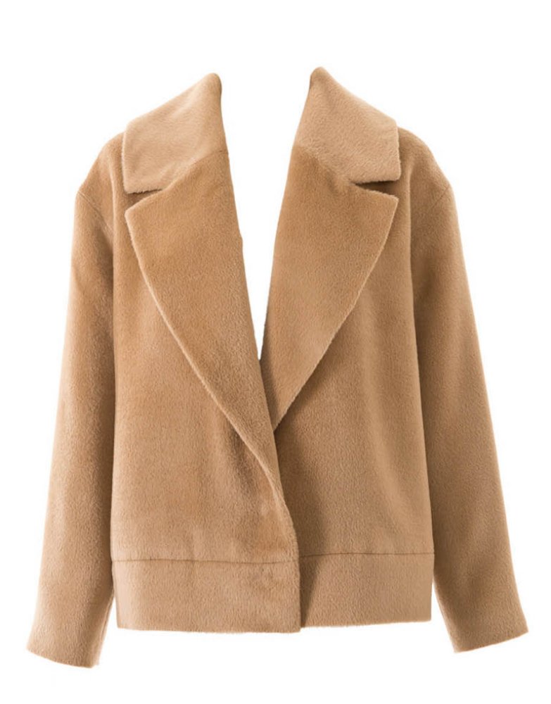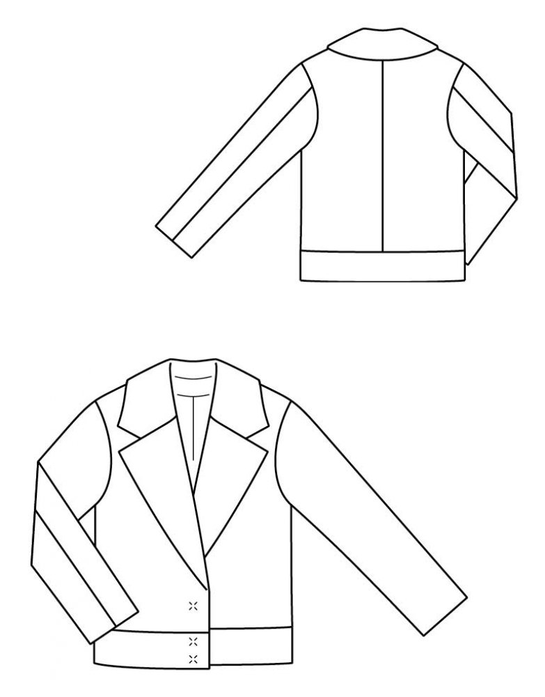 Speciálně pro vyšší ženy je tu střih na kabátek (B) v prodloužené délce. O komfortní nošení bude pečovat vlněný flauš měkký na omak, trendy look propůjčí bílá lakovaná látka na klopách, pásku i lemech rukávů a dokonalý tvar zase obstarají raglánové ramenní vycpávky.