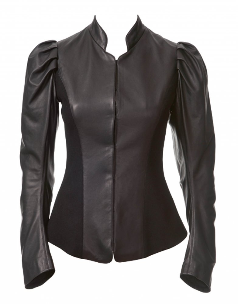 Velkou krejčovskou výzvou je také tento černý, kompletně vypodšívkovaný kabátek se stojáčkem a zapínáním na zip. Nejnápadnějším prvkem jsou rukávy s nařasenými a vysoko zdviženými hlavicemi, osobitým ozvláštněním je pak zkombinování kůže a vlněného sukna.