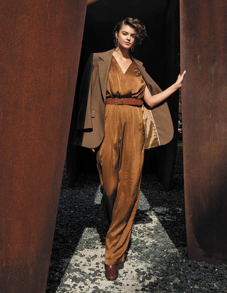 Buďte za všech okolností šik! Overal se spoustou záhybků a dlouhými ramenními švy, které navozují dojem rukávků, oceníte ve všední den i během mimořádných chvil. Tajli pak podtrhnete vlastnoručně zhotovenou vázačkou.
