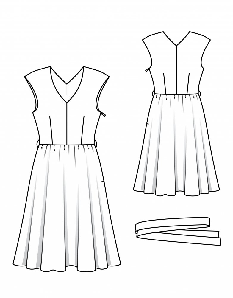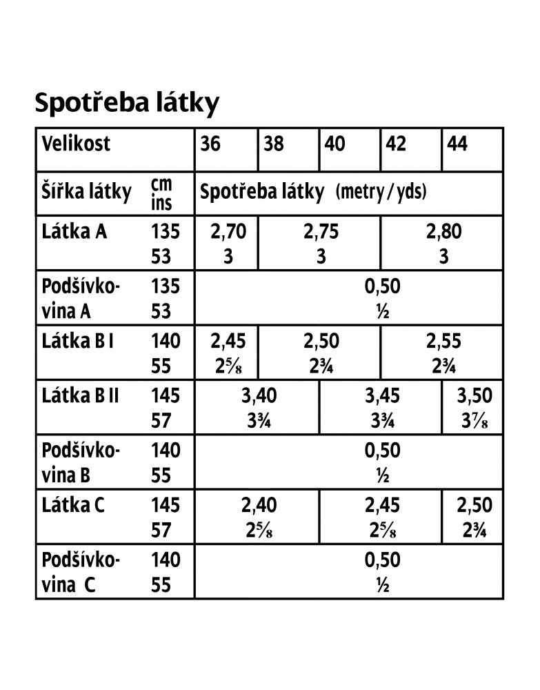 vlizelínový tvarovací proužek; 1 „skrytý“ zip dlouhý 40 cm. Pouze k šatům B: na opasek: vlizelín H 250; 0,15 m x 1,20 m podšívkoviny; 1 spona s trnem, potažená látkou, šířka 4 cm
