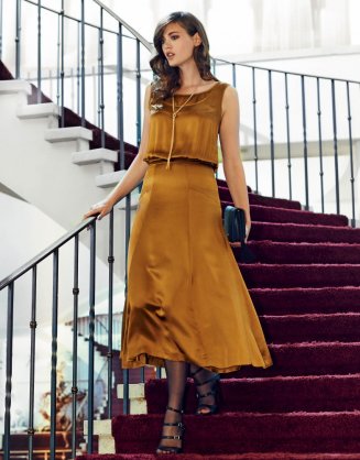 Luxusní vzhled, lehkost, jemnost a přirozená splývavost dokonale charakterizují satén ze 100% hedvábí. Střih půvabných šatů nejspíš i přes členitost sukňového dílu nebude zádrhel, mnohem více vás potrápí manipulace s lesklým materiálem. Vyžaduje totiž značnou dávku zručnosti. Avšak výsledek úsilí stojí opravdu za to! Balíček obsahuje i střih na Zlatavé midišaty (B).