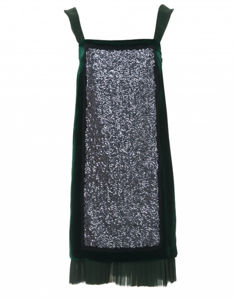 Tentokrát se o své místo na slunci hlásí koktejlové šaty ze zeleného sametu a s nepřehlédnutelnou dominantou ze stříbrné pajetkové látky, a sice ručně našitým obdélníkovým dílem. Trojici materiálů doplňuje šifon – na spodním okraji sukně naplisovaný, na ramínkách s navazující dlouhou vázačkou hladký.